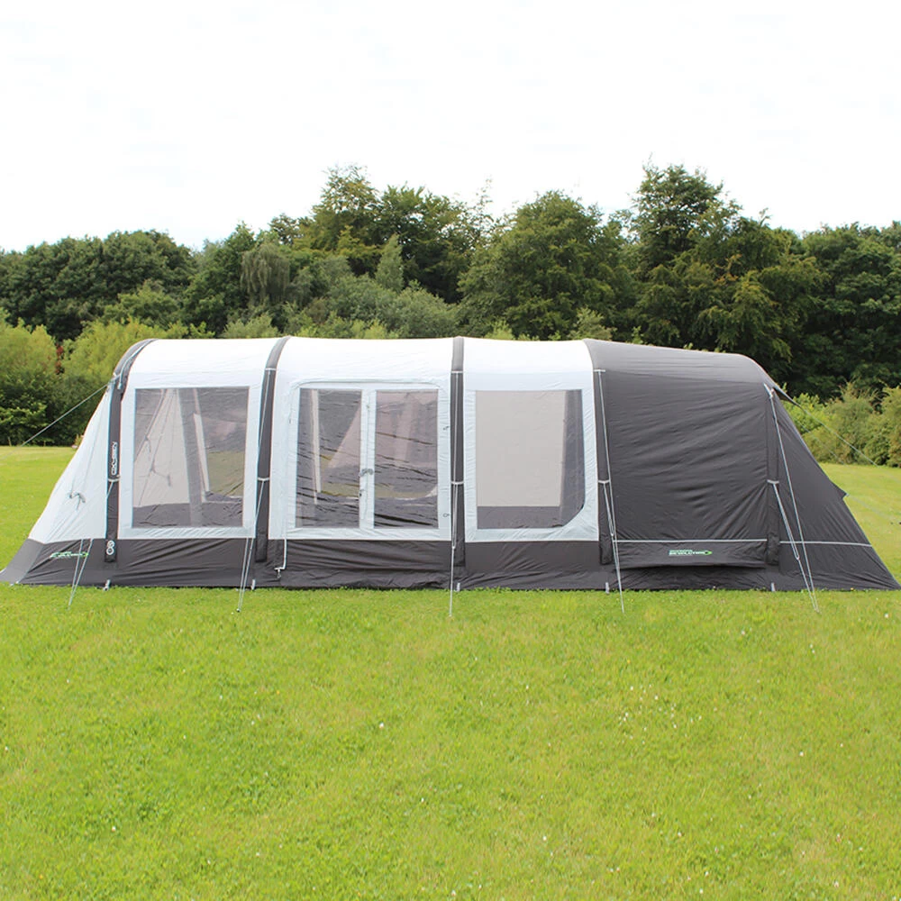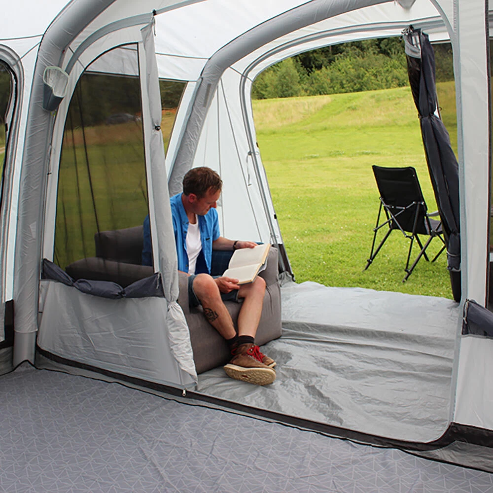 This premium inflatable 6-berth family tent has swiftly become a best-selling family favourite following its introduction in 2018 due to its perfectly sized footprint. The internal space of this 3-zonal tunnel tent is split between 3 flexible bedroom compartments, a great sized living area and a spacious front porch, which can be fully enclosed using the windowed front door. Updated features and benefits for 2022 include a double-width patio style side door with phoenix mesh ventilation adding to the already outstanding functionality of this tent. Including additional mesh ventilation fly screen panels and our vortex bedroom ventilation system, which aid in consistently maintaining pleasant airflow and reducing internal humidity in warmer. The darkened ‘Twilight’ bedroom pods create a comfortable sleeping environment, and a wealth of premium features including zip-up curtains, and a two-thirds roll-back central door makes this tent the choice for discerning family campers. • 240 HDE high density all weather lightweight fabric