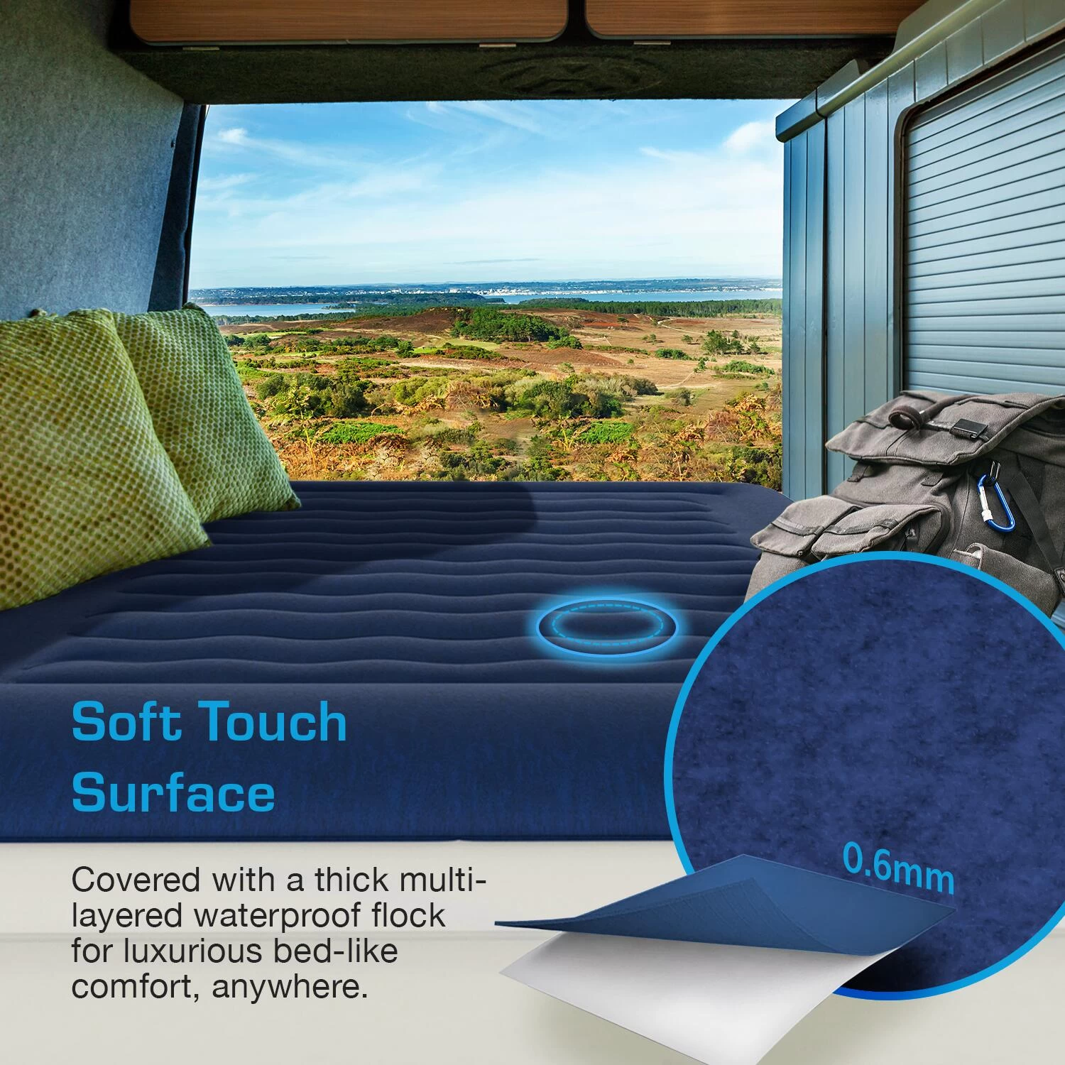High-Quality Construction: The fully waterproof flock coating ensures no rain or spills will penetrate the air bed, while the hard-wearing material protects against punctures and scratches.