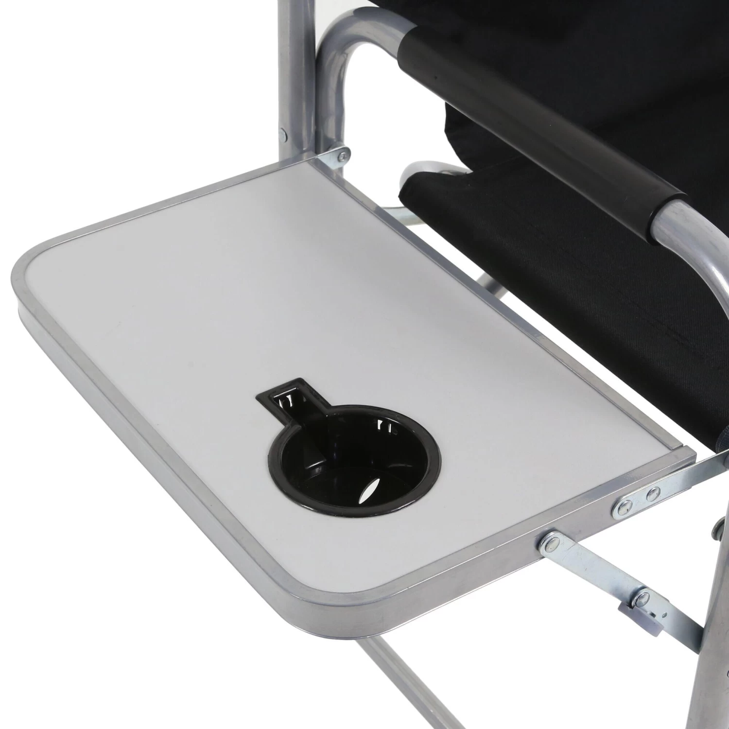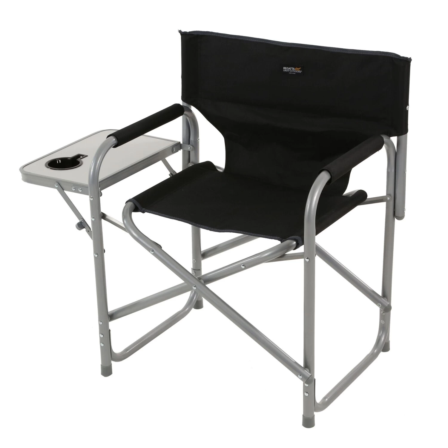 Heavy-duty, steel frame garden / camping chair with a fold-out side table. Folds down flat and packs away.